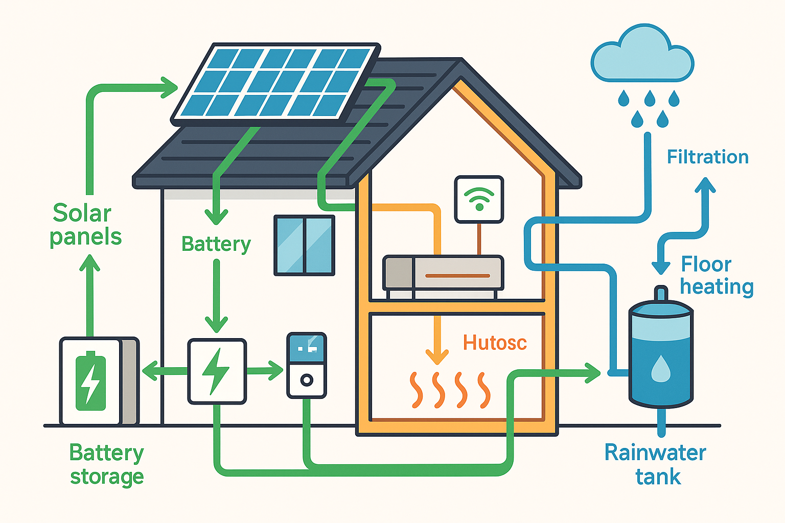 Für die Wärmeversorgung kommen Wärmepumpen, Solarthermie oder Holzöfen in Frage. Die Kombination aus Photovoltaik und Wärmepumpe ist besonders effektiv. Die Wärmepumpe entzieht der Umgebung Wärme und nutzt dafür Strom aus der eigenen Solaranlage.