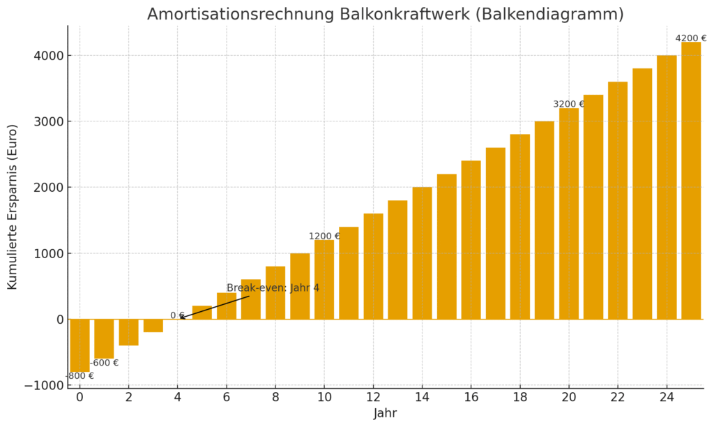 Die Rechnung ist einfach: 800 € ÷ 210 € = 3,8 Jahre bis zur Amortisation. Nach knapp 4 Jahren hast du die Anschaffungskosten wieder eingespielt. Da Solarmodule eine Lebensdauer von 20 bis 25 Jahren haben, produzierst du danach für etwa 16 weitere Jahre fast kostenlosen Strom.