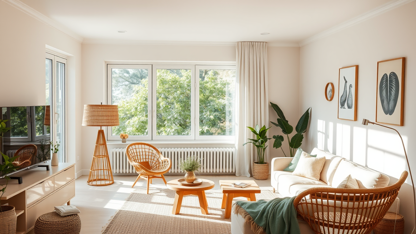 Textilien ergänzen das Bild. Leinen, Baumwolle, Wolle: Auch hier setzt du auf Natur. Ein Leinenkissen auf dem Rattansessel. Eine Baumwolldecke über der Holzbank. Diese Schichten machen deinen Raum gemütlich.